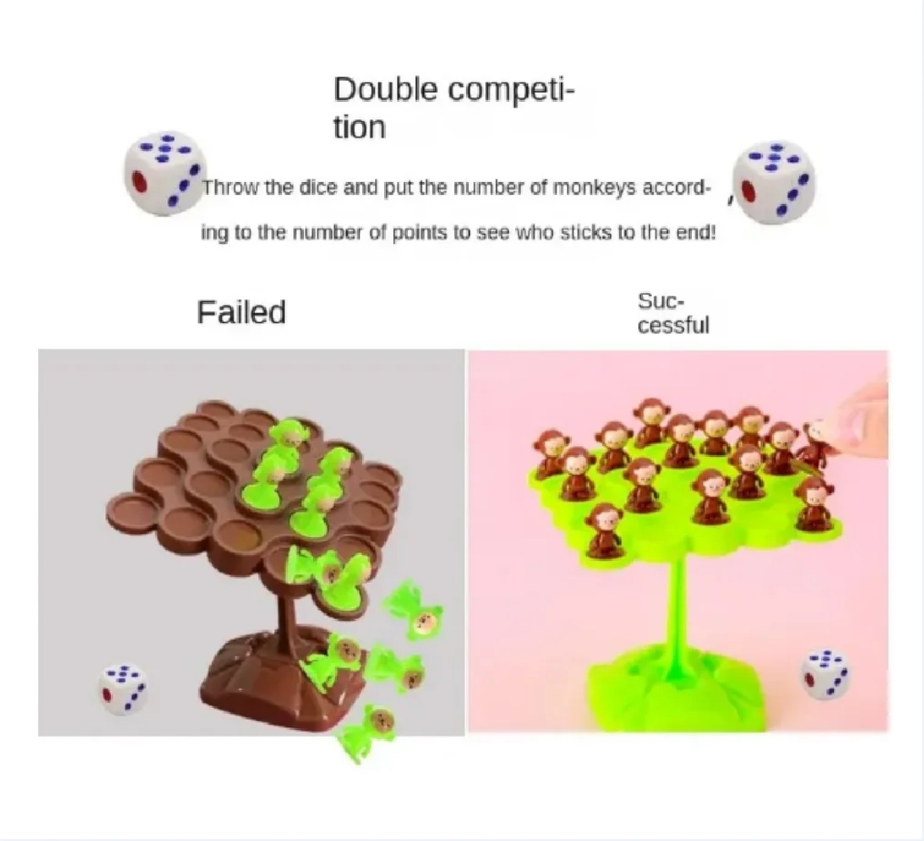 - 🎲 قم برمي النرد لتحديد عدد القردة التي ستضعها على ميزان الشجرة.